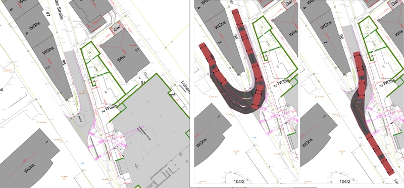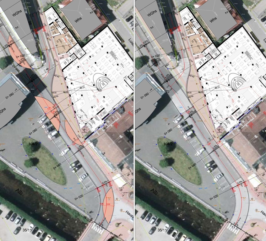 Verschiedene Gestaltungsmöglichkeiten werden gemeinsam untersucht: von einer einfachen Aufpflasterung in den Kreuzungsbereichen bis hin zu deutlich sichtbaren Halbkreisen in der Fahrbahn. Die Gestaltungsform der Halbkreise ist von der Albtalstraßensanierung übernommen und fügt sich hier ideal zur Ellipsenform des Vorplatzes der Sparkasse ein. Die Pflasterung des Halbkreises zur Hauptstraße erweckt den Anschein, dass es sich bei der Menzenschwander Straße um eine übergeordnete Straße mit abknickender Vorfahrt handelt und fördert die Verlangsamung des fließenden Verkehrs. Die Pflasterung im Knotenbereich übernimmt auch einen Teil der Entwässerung, da hier das Längs- und Quergefälle sehr gering ist. Die doppelten Halbkreise dienen als optische Verbindung und als Überquerungshilfe vom Parkplatz (des alten Postgebäudes) schräg über die Menzenschwander Straße direkt zum neuen Haupteingang der Keemss Arkaden.
