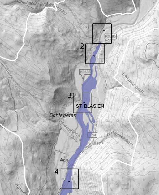 Umsetzung der WRRL (Wasserrahmenrichtlinie) an der Alb auf der Gemarkung Schlageten;Herstellung der Durchgängigkeit der Hauensteiner Alb, an einem Wehr und drei Abstürzen zwischen Schlageten und Kutterau die im Zuständigkeitsbereich der Stadt St.- Blasien liegen.