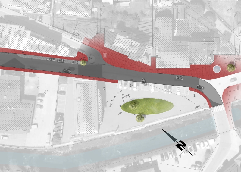 Verschiedene Gestaltungsmöglichkeiten werden gemeinsam untersucht: von einer einfachen Aufpflasterung in den Kreuzungsbereichen bis hin zu deutlich sichtbaren Halbkreisen in der Fahrbahn. Die Gestaltungsform der Halbkreise ist von der Albtalstraßensanierung übernommen und fügt sich hier ideal zur Ellipsenform des Vorplatzes der Sparkasse ein. Die Pflasterung des Halbkreises zur Hauptstraße erweckt den Anschein, dass es sich bei der Menzenschwander Straße um eine übergeordnete Straße mit abknickender Vorfahrt handelt und fördert die Verlangsamung des fließenden Verkehrs. Die Pflasterung im Knotenbereich übernimmt auch einen Teil der Entwässerung, da hier das Längs- und Quergefälle sehr gering ist. Die doppelten Halbkreise dienen als optische Verbindung und als Überquerungshilfe vom Parkplatz (des alten Postgebäudes) schräg über die Menzenschwander Straße direkt zum neuen Haupteingang der Keemss Arkaden.